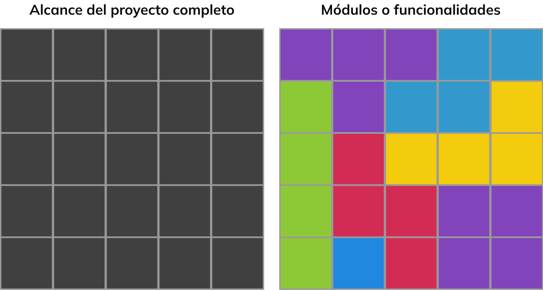 El dividir una aplicación por módulos o funcionalidades depende mucho de la complejidad de la aplicación. Por ejemplo, en una aplicación para una empresa constructora un módulo podría ser “proyectos”, pero si dentro de este módulo hay diferentes funcionalidades complejas, es recomendable trabajar por funcionalidades, para así asegurar un ritmo más elevado de despliegues y pruebas.