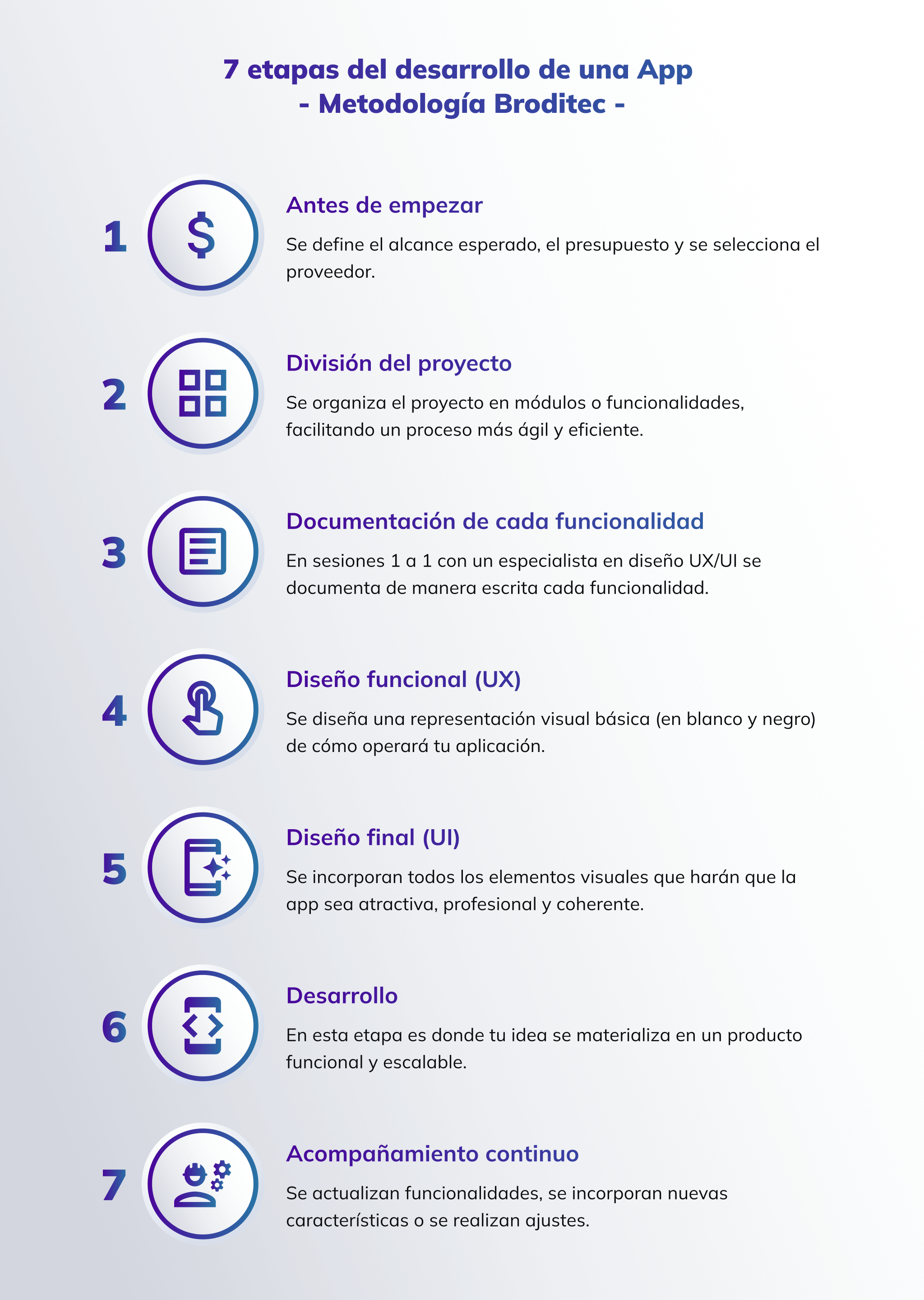 En Broditec somos especialistas en el diseño y desarrollo de aplicaciones móviles y aplicaciones web, razón por la cual hemos desarrollado nuestra propia metodología que asegura resultados de alta calidad y soluciones que realmente funcionan.